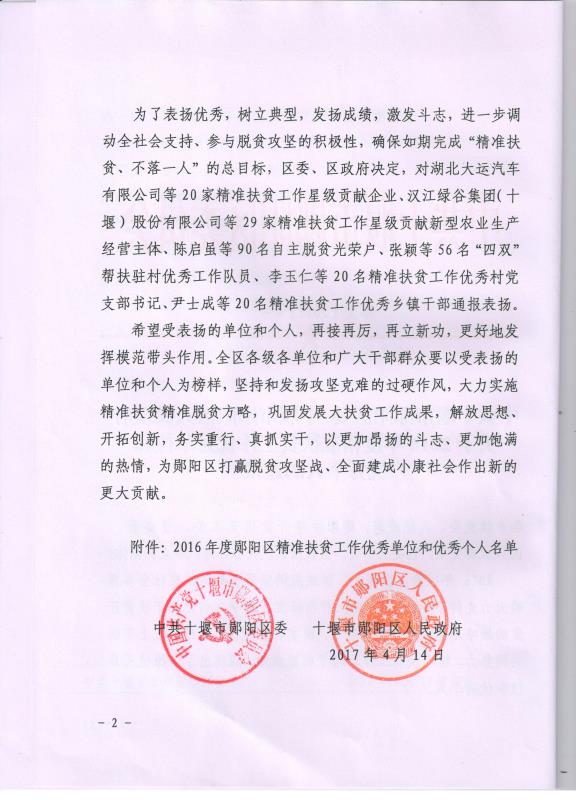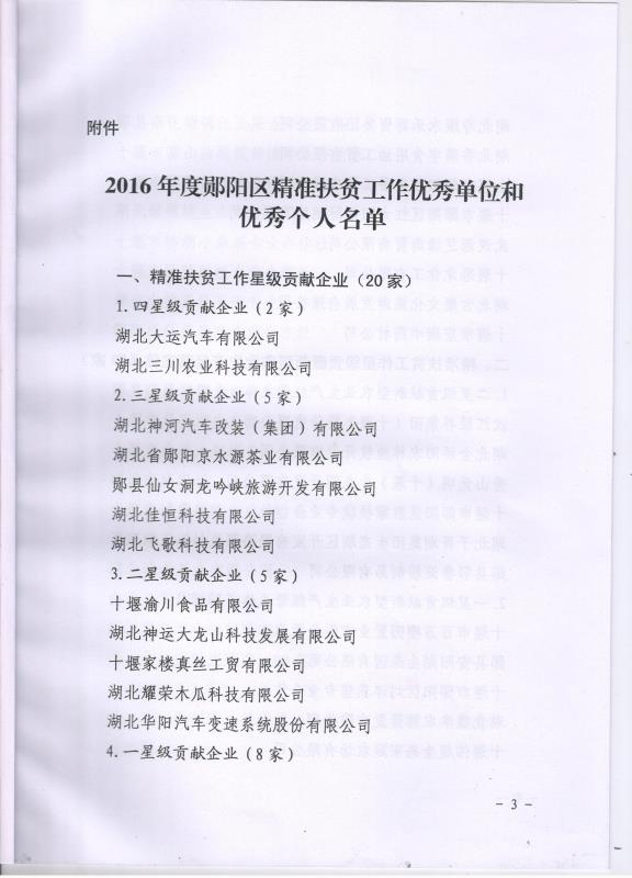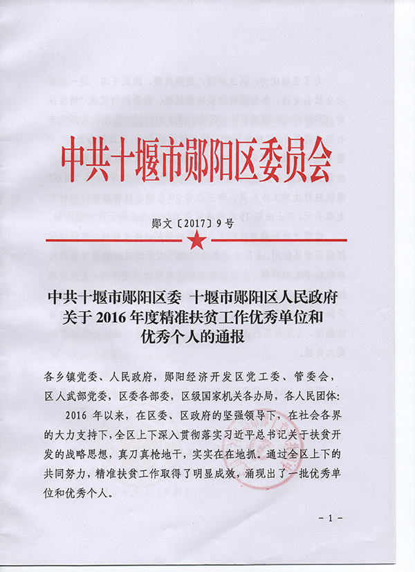 近日,湖北三川农业生态科技有限公司被中共十堰市郧阳区委、十堰市郧阳区人民政府授于“2016年度精准扶贫工作四星级贡献企业”荣誉称号。